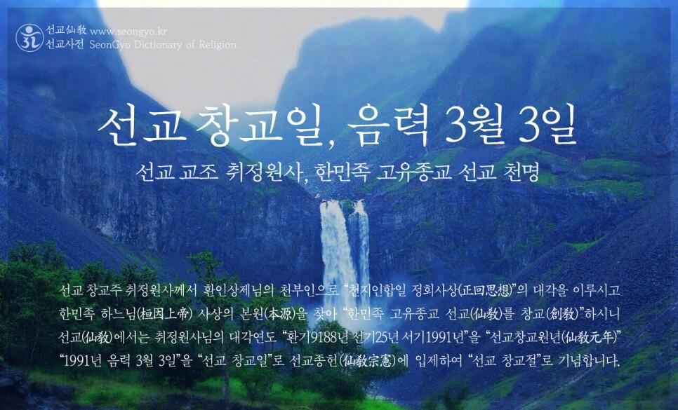 선교 교조 취정원사께서 한민족 하느님 사상의 본원(本源)을 찾아 선교(仙敎)를 창교하신 “선교창교일”은, 1991년 음력 3월 3일 입니다.